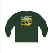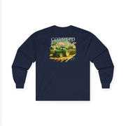 This Long Sleeve Tee features watercolor artwork of a rural Midwest farm with a tractor working the fields and a slogan that says Corn Fed Classics. It gives a cozy and rustic vibe, perfect for those who love the countryside and the American MidWest.